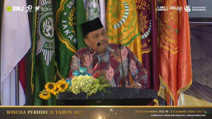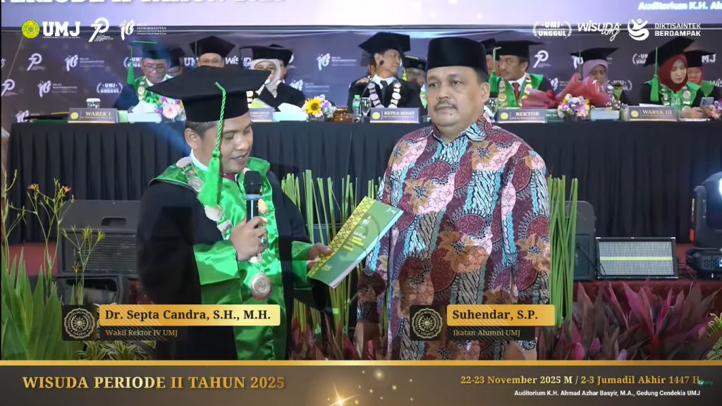 Jakarta — 22 November 2025. Prosesi Wisuda Universitas Muhammadiyah Jakarta (UMJ) sesi pertama berlangsung khidmat di Gedung Cendekia dan menjadi momen bersejarah bagi para lulusan. Acara ini tidak hanya menandai kelulusan akademik, tetapi juga menjadi titik awal perjalanan mereka sebagai bagian dari keluarga besar Ikatan Alumni Universitas Muhammadiyah Jakarta (IKALUM UMJ). Hadir mewakili IKALUM, Suhendar S.P memberikan sambutan yang hangat dan penuh motivasi.